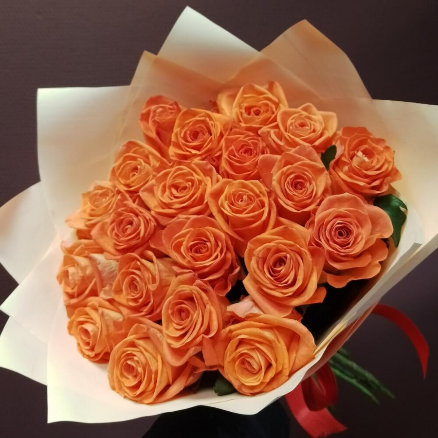 На фото букет из 19 оранжевых роз. В составе: роза 19 шт, дизайнерская упаковка 1 шт, атласная лента 1 шт, . Все цветы свежие и ароматные, букет красиво оформлен и отлично подходит для подарка. Доступна доставка цветов или самовывоз.
