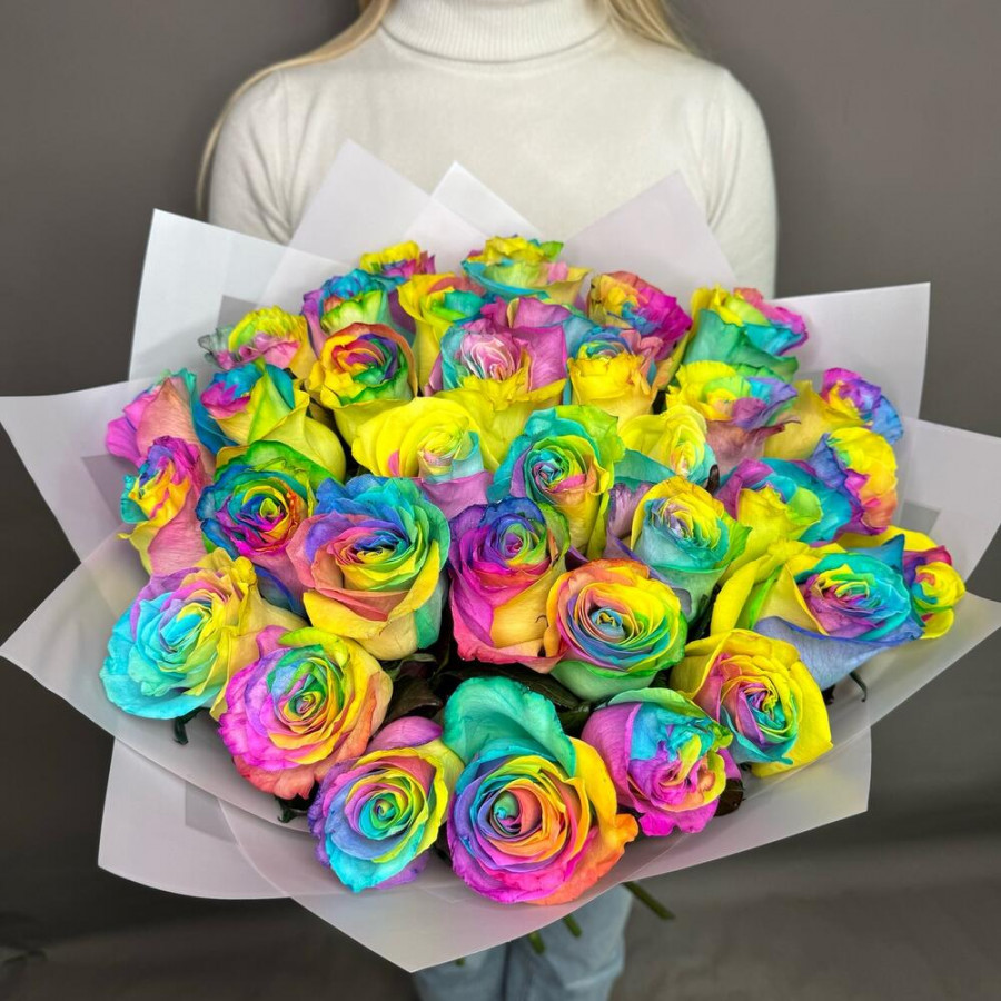 Радужная роза - 35 шт. Дизайнерская упаковка - 1 шт. бант атласный - 1 шт.