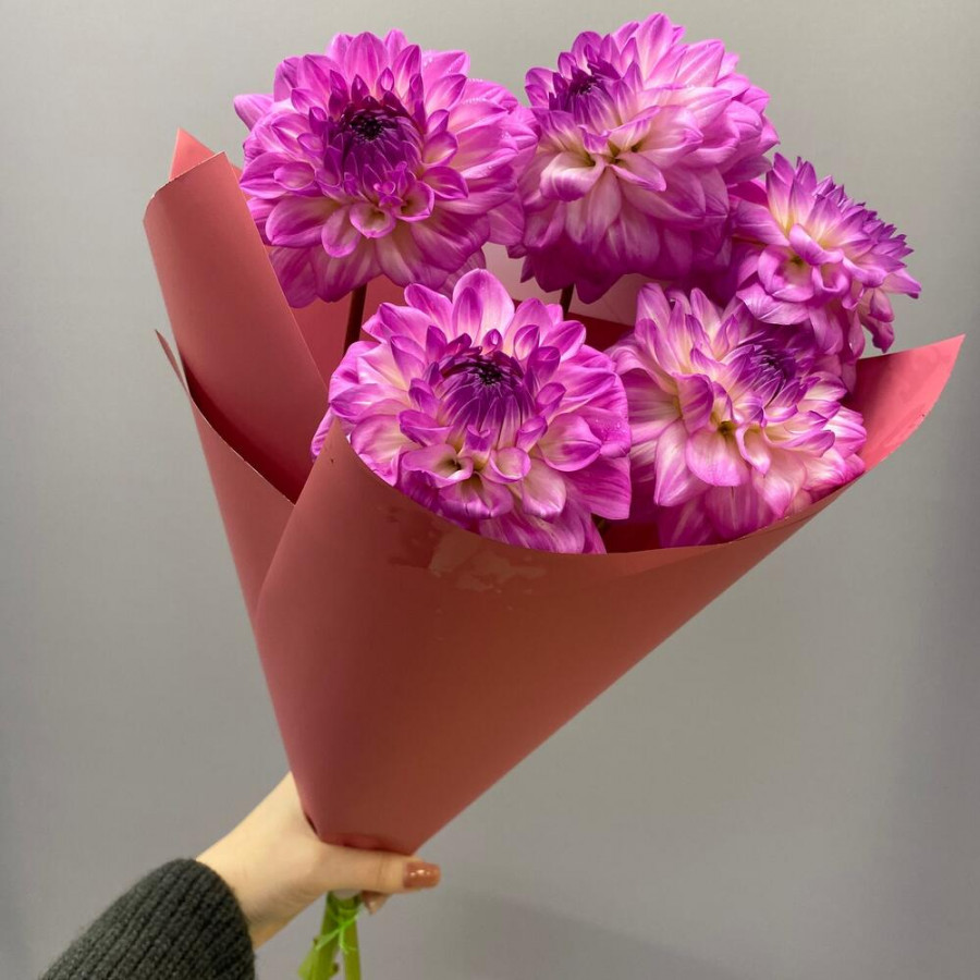 На фото букет из 5 розово-сиреневых георгин. В составе: георгина 5 шт, дизайнерская упаковка 1 шт, атласная лента 2 шт, . Все цветы свежие и ароматные, букет красиво оформлен и отлично подходит для подарка. Доступна доставка цветов или самовывоз.